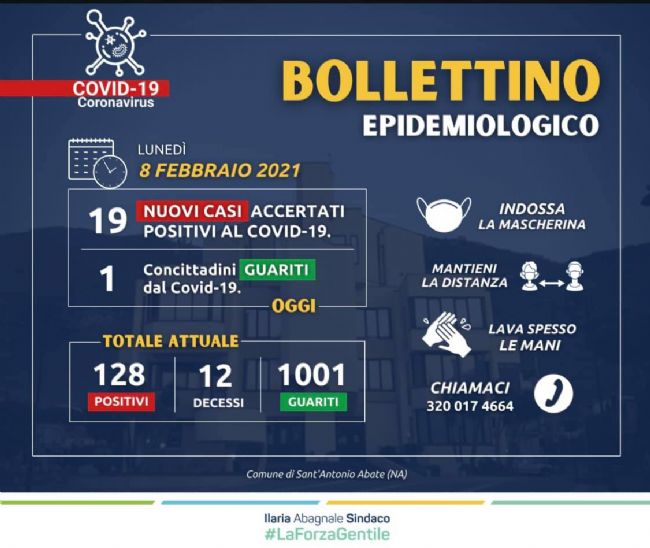 Impennata di contagi nel comune abatese. Il bollettino epidemiologico ha reso nota ieri sera la positività al Covid-19 di altri 19 cittadini di Sant'Antonio Abate. Un solo abatese, invece, è stato ufficialmente dichiarato guarito. Pertanto, sono 128 i cittadini attualmente positivi al virus. Di seguito le parole del sindaco Ilaria Abagnale: