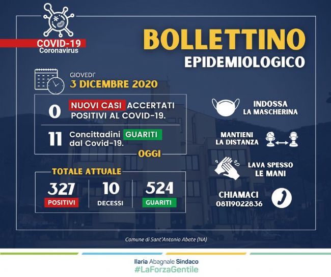 Le comunicazioni altalenanti devono però ricordarci che il pericolo di contagio esiste tuttora e deve essere assolutamente allontanato se vogliamo goderci il Natale con un piccolo sorriso in più. Forza, abatesi, continuiamo ad agire responsabilmente!» così la sindaca Ilaria Abagnale.