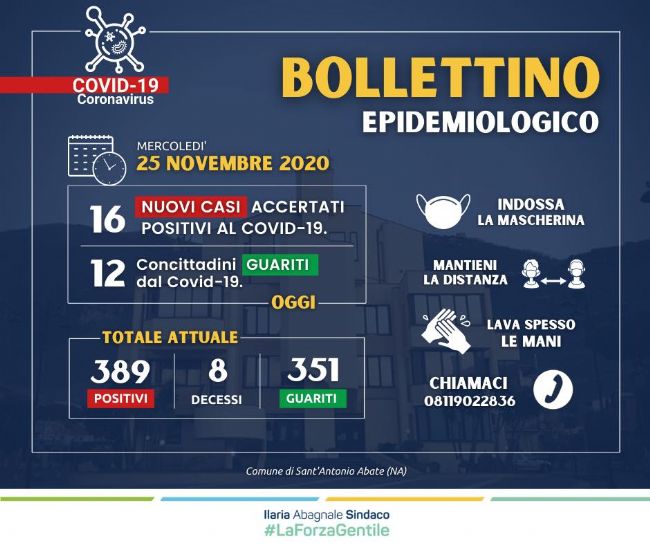 «Fortunatamente, anche questa sera il numero dei positivi attuali aumenta di poco, restando pressoché invariato. Ciò a cui tutti miriamo è veder questo numero azzerarsi. Serve ancor maggiore collaborazione, da parte di tutti. Forza, abatesi!» così la sindaca Ilaria Abagnale.