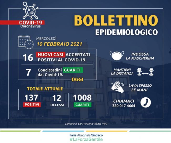 «Dopo che una giornata di fermo ha alimentato la nostra speranza, una nuova comunicazione dell’ASL ci riporta alla realtà. Questa sera, registriamo 16 nuovi positivi e 7 guariti. Il totale si ferma a 137.» così ieri sera ha reso noto la sindaca Ilaria Abagnale. «L’andamento epidemiologico è tenuto sotto costante osservazione. Seguiranno aggiornamenti.»