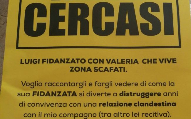 Un annuncio alquanto insolito è comparso per tutta Scafati, volantini appesi da una ragazza di nome Michela. L'ultima trovata di una ragazza tradita con l'intento di mettersi in contatto con il fidanzato dell’amante del suo compagno. Michela ha inoltre lasciato il suo numero sul foglio giallo per essere contattata. Un gesto che ha scatenato l'ironia sui social e non è escluso possa trattarsi di uno scherzo o una trovata pubblicitaria. Così come non si esclude che questa Michela sia solo inventata e abbia deciso di mettere al corrente il partner dell'amante, anche lui tradito.
