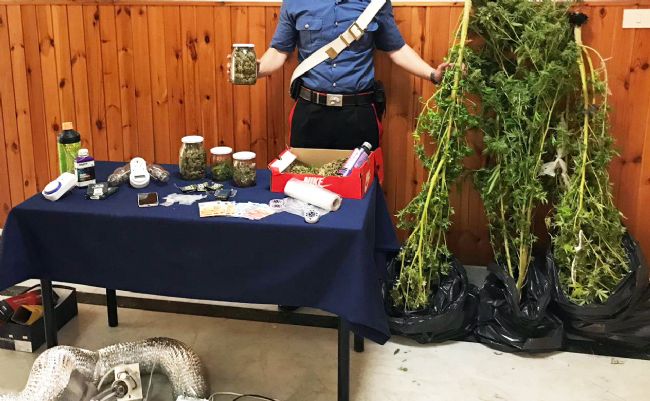 I militari, perquisendo l’abitazione dell'uomo, hanno rinvenuto e sequestrato 191 grammi di marijuana, 3 piante di cannabis indica alte circa 170 cm, 350 euro in contante oltre a termostati, trita erba, cellophane e concimi.