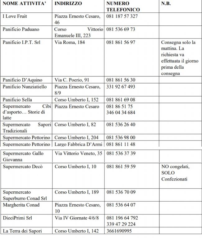 L’elenco verrà aggiornato di volta in volta con l’inserimento di ulteriori attività che potranno fornire la propria disponibilità contattando l’ufficio di Segretariato Sociale al numero 081.53.58.605, dal lunedì al venerdì, dalle ore 10 alle ore 13, oppure scrivendo all’indirizzo di posta elettronica segret.sociale@gmail.com.