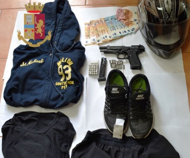 I poliziotti, grazie alle immagini del sistema di videosorveglianza cittadino del Comune di Torre Annunziata, hanno individuato e rintracciato il conducente il quale ha ammesso di aver utilizzato quello stesso scooter per commettere due rapine ad altrettante farmacie di Torre Annunziata il 25 e il 26 agosto scorsi nel corso delle quali, armato di pistola, si era fatto consegnare gli incassi. Inoltre, gli operatori hanno rinvenuto, nell'abitazione dell'uomo, una pistola priva di tappo rosso con 50 cartucce a salve di cui 16 inserite nel caricatore e diversi capi di abbigliamento e un casco corrispondenti a quelli utilizzati per commettere le rapine.