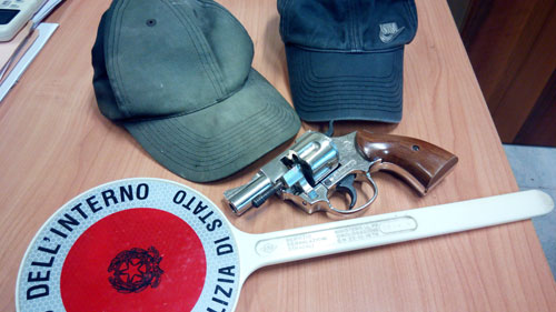 La pistola utilizzata, ritratta nella foto in basso, è una riproduzione autentica in metallo di un revolver "olimpic 38" calibro 380 mm. K, priva del tappo rosso ed idonea per esplodere colpi a salve.