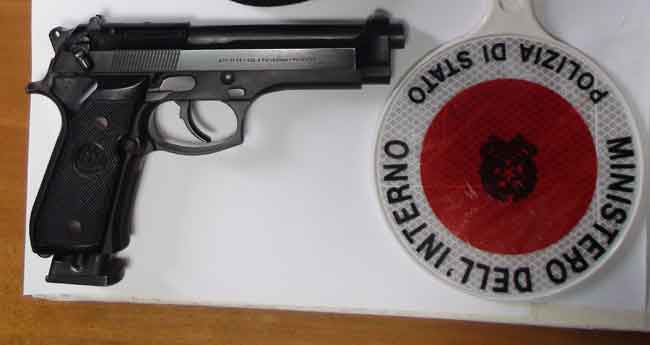 In seguito ad una perquisizione sul posto, in via Prota, l’uomo è stato trovato in possesso di una pistola semiautomatica, con caricatore contenente numero 8 colpi a salve, che aveva nella cintola dei pantaloni, successivamente risultata essere una perfetta riproduzione della Beretta Mod. 92F in uso alle forze di polizia, privata del tappo rosso.