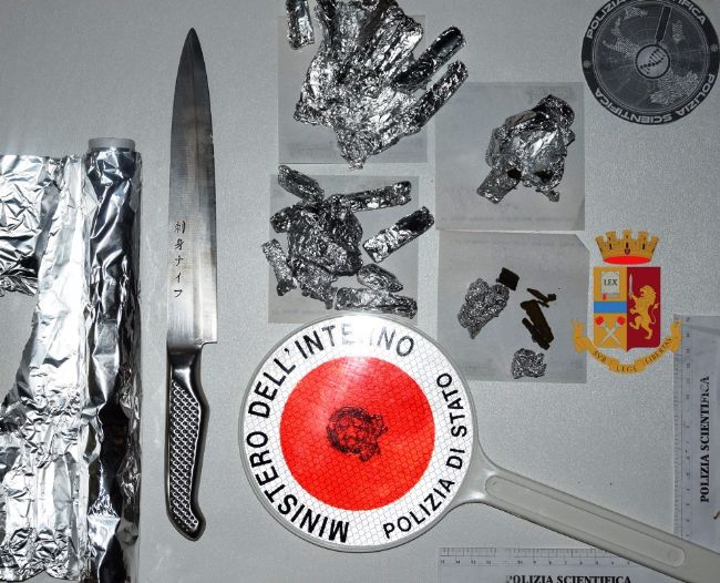 Una perquisizione all’appartamento ha consentito agli agenti di recuperare un rotolo di carta stagnola, idonea al confezionamento delle dosi, un coltello con lama di 20 cm, annerita dal taglio dello stupefacente e, nelle adiacenze della sua abitazione, stesso luogo dove fu rinvenuto lo stupefacente il 12 ottobre, tre involucri di carta stagnola contenenti dosi già pronte di sostanza stupefacente del tipo Hashish per un peso complessivo di circa 56 grammi.