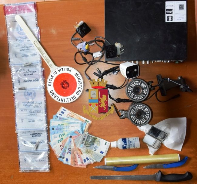 Gli agenti hanno bussato alla porta dell’uomo che apriva dopo diversi muniti. All'interno dell'abitazione, i poliziotti, hanno rinvenuto tutto il materiale per il confezionamento della sostanza stupefacente e la somma di euro 665,00. Inoltre hanno scoperto e sequestrato l'intero impianto di video-sorveglianza che il 35enne aveva allestito sui lati dell'abitazione e sul lastrico solaio per inquadrare le vie dì accesso all'abitazione. Altri agenti si erano appostati nei pressi del pozzetto raccoglitore delle acque di scarico all’esterno dell’abitazione dove, di fatti hanno recuperato diverse dosi di cocaina e un bilancino di precisione che l’uomo aveva gettato nello scarico all’arrivo della Polizia. L’uomo è stato arrestato.