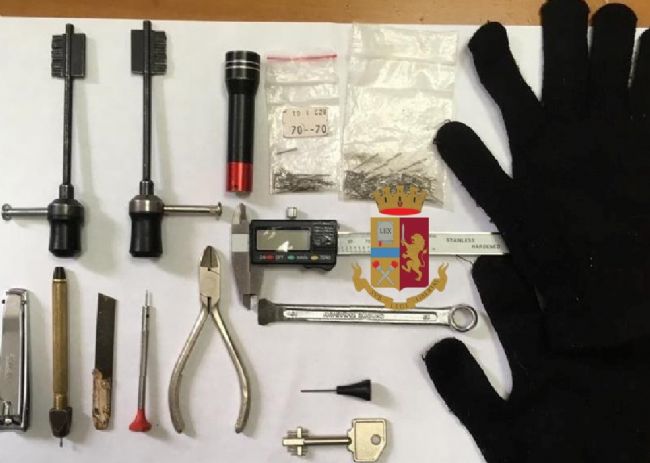 Gli agenti hanno bloccato i due e hanno rinvenuto una serie di chiavi alterate, grimaldelli, guanti di lana ed altri arnesi atti a compiere furti in appartamento.