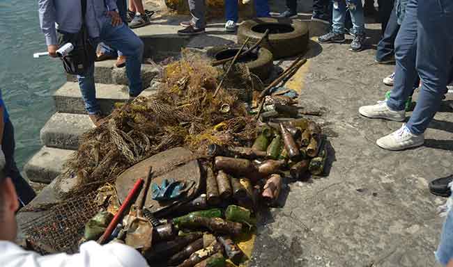 Gli uomini del 2° Nucleo Subacquei  Guardia Costiera, Centro Subacqueo di Torre del Greco, aiutati dai volontari di Legambiente e di ARCI Pesca F.I.S.A. Torre del Greco, dagli studenti ISISS "C.COLOMBO" Sez ITTL hanno portato in superficie contenitori di plastica, copertoni e tantissime bottigle di vetro.