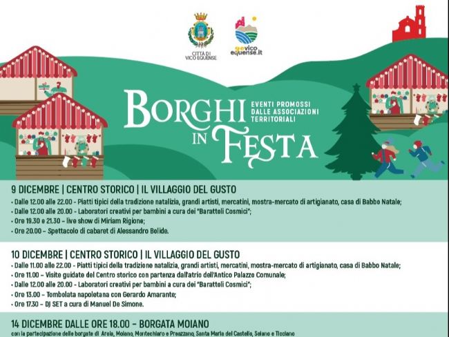 Le associazioni di Vico Equense si sono date appuntamento all'interno della caratteristica cornice del centro storico della città. Acli (Ticciano), Aicast (Vico Equense), Ami (Montechiaro), la comunità di Moiano, Gens Seja (Seiano), Gruppo Quartiere Vescovado (Centro Storico), Punta del Vento (Santa Maria del Castello) e le parrocchie dei Santi Ciro e Giovanni, di Sant'Antonino di Arola, di San Renato a Moiano e di Preazzano, hanno dato vita a Borghi in Festa un calendario ricco di manifestazioni per cittadini e turisti. Stand enogastronomici, laboratori culinari, giochi e intrattenimento per i più piccoli, artisti di strada, concerti di musica dal vivo e spettacoli teatrali. Un evento di connessione e solidarietà accolto e condiviso dall’amministrazione comunale, che inizierà sabato 9 dicembre 2023. “Borghi in Festa è un lavoro comune per il bene comune. Un’occasione per rafforzare i legami, condividere la gioia e creare una tradizione unica che rimarrà nei nostri cuori per gli anni a venire. Ecco perché vi invitiamo a partecipare per rendere ogni evento un successo" dicono i rappresentanti delle varie associazioni.