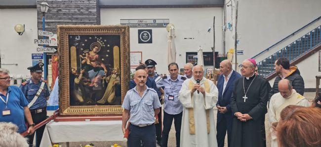 Una giornata storica per Pompei e Vico Equense. Oggi 26 luglio hanno avuto inizio i cinque giorni di pellegrinaggio della Madonna del Rosario. Ma ciò che ha inorgoglito, e incuriosito, ancora di più i fedeli è stata la prima volta del quadro della Madonna in Circumvesuviana. La sacra rappresentazione della Beata Vergine è partita alla stazione di Pompei Scavi ed è arrivata a Castellammare Centro. Da lì il pellegrinaggio è proseguito per la Funivia che conduce al Monte Faito. Tantissimi i fedeli che all’arrivo hanno accolto il quadro della Madonna nel piazzale antistante la stazione, dove si è tenuto un momento di preghiera. «Un fatto storico e unico nella sua concretezza –spiega Don Catello Malafronte-, e molto antico nel cuore di Bartolo Longo, che aveva una venerazione particolare per San Michele. Da sempre il Faito ha la Madonna nel cuore. Saranno giorni di grazia per tutti quanti.» è poi intervenuto Giuseppe Aiello, il sindaco di Vico Equense: «Mi associo ai ringraziamenti. Vivo tante emozioni da sindaco, ma questa è una delle più grandi vissute finora. Ho percepito una sensazione di rinascita. Come amministrazione ci siamo fatti trovare pronti. Ringrazio Don Catello e Mons. Caputo a nome di tutta la città di Vico Equense.» ha poi preso parte ai ringraziamenti l’ing. Pasquale Esposito. «L’Eav nasce per servire. Sono qui per rappresentare il cuore di Eav: gli uomini e le donne che lavorano con passione. Chi ha fede segue anche la dottrina nel rispetto degli altri, noi siamo nati per servire.» sul posto anche Tristano Dello Ioio, presidente del Parco Monti Lattari: «è per noi un grande onore come parco e come comunità. Sono anni di rilancio per questa montagna. Spero che il sindaco e le altre istituzioni faranno la loro parte. Questa è la rappresentanza del massimo che è stato fatto.»
