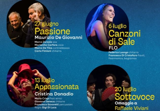 Le serate in cortile - con inizio alle ore 20,00 e ad ingresso libero fino ad esaurimento dei duecento posti disponibili - prenderanno il via, sotto la direzione artistica di Gigi Di Luca, il prossimo 27 giugno. Ad inaugurare la rassegna sarà "Passione", l'esibizione di Marco Zurzolo e Maurizio De Giovanni. Giovedì 6 luglio sarà la volta invece del concerto della cantautrice Flo con "Canzoni di Sale". Quindi, nuovo appuntamento il 13 luglio con lo spettacolo "Appassionata", che vedrà protagonista l'attrice Cristina Donadio. Concluderà la rassegna "Sottovoce", il 20 luglio, un omaggio a Raffaele Viviani di e con Ernesto Lama.