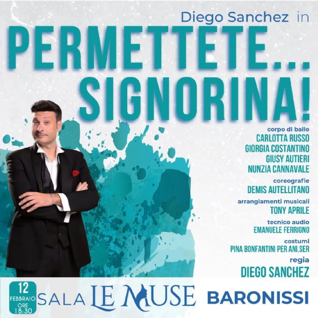 Un viaggio immaginario in varie epoche teatrali. Domani alle ore 18:30 debutterà sul palco della Sala Le Muse di Baronissi, “Permettete…signorina!”, con la regia di Diego Sanchez. Lo spettacolo prende spunto dalla famosa canzone di Nicola Arigliano, dove però a suscitare emozioni e batticuori non sarà una "bimba carina" ma bensì l'amore per l'arte e la musica. Un viaggio immaginario del protagonista accompagnerà lo spettatore in varie epoche teatrali. Le coreografie sono curate da Demis Autellitano, coreografo stabiese e titolare del Centro Professionale Arte Danza sito in Via Pomponio. Il corpo di ballo è composto da Carlotta Russo, Giorgia Costantino, Giusy Autieri e Nunzia Cannavale. Arrangiamenti musicali, Tony Aprile e tecnico audio Emanuele Ferrigno. Costumi, Pina Bonfantini per Ani.Ser.