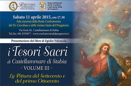 Sarà presentato al pubblico il prossimo 11 aprile 2015 (ore 17,30) il terzo volume della serie I Tesori Sacri di Castellammare di Stabia, che lo studioso Egidio Valcaccia dedica questa volta alle opere d'arte pittoriche presenti nelle chiese stabiesi del Settecento e del primo Ottocento: "L'autore ci offre un'attenta e dettagliata schedatura delle pitture presenti in città, mettendo in evidenza un'autorità religiosa ben consapevole del proprio volere di committente"(Gino Coppola).
