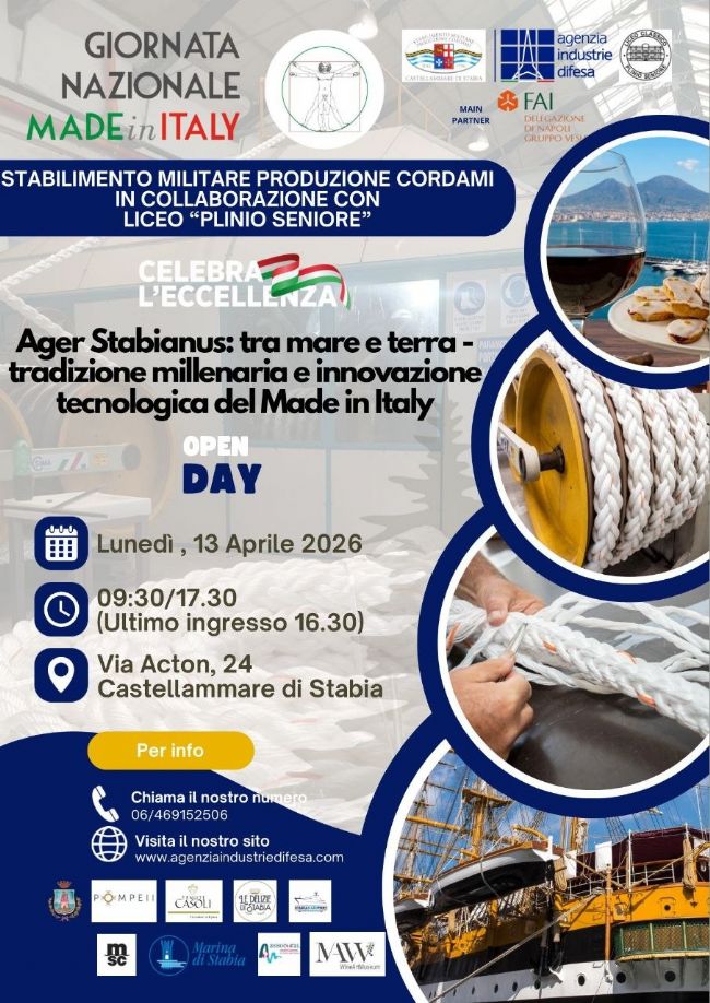 Castellammare di Stabia si prepara a celebrare una delle sue eccellenze storiche e produttive in occasione della Giornata Nazionale del Made in Italy. Il prossimo 13 aprile lo Stabilimento Militare Produzione Cordami, erede dell’antica Corderia borbonica, aprirà eccezionalmente le sue porte al pubblico per un evento che unisce storia, cultura e innovazione.