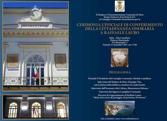 Alla presenza del sindaco Giuseppe Tito e dell'amministrazione intera, il senatore ex Pdl e poi scrittore Raffaele Lauro verrà insignito della cittadinanza onoraria di Meta. Ore 10,00 l'appuntamento con tutti, per assistere al discorso dell'autore della ormai celebre trilogia sorrentina di romanzi storici divisi fra Sorrento, Vico e Sant'Agata ma ambientati nei secoli passati. Dopo le presentazioni dell'ultimo volume durante l'estate trascorsa, arriva dunque l'onoreficenza per Raffaele Lauro a titolo di ringraziamento per quanto fatto per la sua terra sia da politico che da uomo di cultura e scrittore. Un Consiglio comunale straordinario è stato pertanto convocato dal presidente dell'assemblea metese Michele Castellano, per venerdì 15 settembre al mattino.