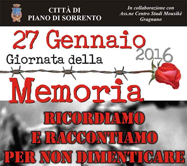 La Città di Piano di Sorrento celebra la Giornata della Memoria, ricorrenza internazionale in cui tutta l'umanità ricorda le vittime dell'Olocausto, termine greco con il quale si indica il genocidio di circa 15 milioni di donne, uomini e bambini, tra cui 6 milioni di ebrei, messo in essere dall'Europa nazifascista fino al 27 gennaio del 1945, quando fu liberato il campo di concentramento di Auschwitz.