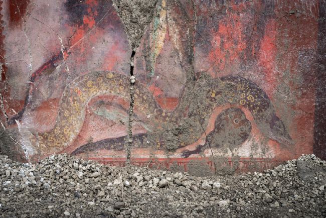 Polli, anatre, pernici, un cinghiale accompagnano ceste di giunco ricolme di pesce azzurro, calamari e molluschi in conchiglia, dipinti su uno sfondo di pareti rosse che invitano ad un ricco banchetto, e che rimandano ai momenti conviviali del mondo antico. Gli affreschi emergono dal cantiere in corso, che mira alla messa in sicurezza della zona di margine tra l’area scavata e quella interrata. L’intervento si colloca tra le attività per il miglioramento dell’assetto idrogeologico del sito, finalizzato a rendere la tutela del vasto patrimonio pompeiano (più di 13mila ambienti in 1070 unità abitative, oltre agli spazi pubblici e sacri) più efficace e sostenibile.