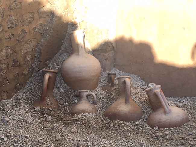 Le anfore rinvenute intatte, dovevano contenere olio, vino e salse di pesce: un'anfora presenta iscrizioni dipinte in cui si leggono numeri, a indicare i quantitativi, e, verosimilmente, il prodotto contenuto. L'uso come deposito dell'ambiente è confermato dai graffiti visibili su una delle pareti dell'ambiente, che ribadiscono l'attività di stoccaggio.