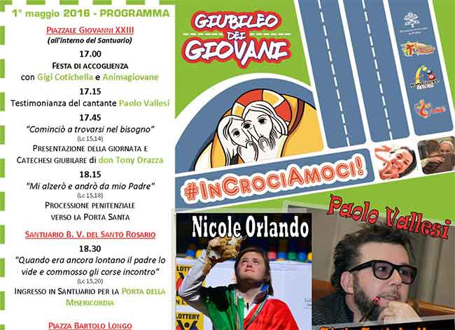 Organizzato dal Servizio per la Pastorale Giovanile, guidato da don Ivan Licinio e Vittorio Tufano, l’appuntamento avrà inizio nel pomeriggio, alle 17, presso il Piazzale San Giovanni XXIII. Qui, ad accoglierli ci sarà Gigi Cotichella, Presidente di “AnimaGiovane”, che introdurrà i giovani al tema della giornata. Il cantante Paolo Vallesi dialogherà con loro, offrendo la sua testimonianza e, poi, don Tony Drazza, Assistente nazionale del settore giovani di Azione Cattolica, terrà una catechesi sulla parabola del Padre Misericordioso. In preghiera, i giovani attraverseranno, poi, la Porta Santa della Basilica, e, alle 19, in Piazza Bartolo Longo, parteciperanno alla santa Messa presieduta da monsignor Tommaso Caputo, Arcivescovo di Pompei.