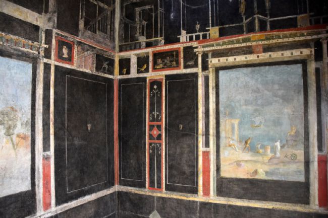Gli affreschi raffigurano in uno degli ambienti un giardino luminoso, immaginato di giorno nel pieno rigoglio del verde, con una tale precisione di dettagli da rendere possibile il riconoscimento delle specie vegetali e nell’altro, un giardino immerso nel buio della notte, con tre alberi di diversa grandezza, tra cui il grande fico con il serpente, auspicio di prosperità.