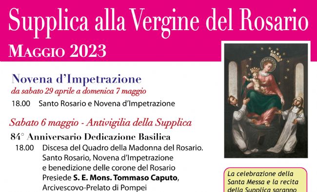 Da sabato 29 aprile è iniziata la Novena che sarà recitata, ogni sera, fino alla vigilia del 7 maggio, all’Altare della Madonna, dopo il Santo Rosario delle 18. A partire dal 1° maggio, come da tradizione, ha avuto, invece, inizio il “Buongiorno a Maria”. L’appuntamento con la preghiera con cui i fedeli affidano alla Madonna il nuovo giorno che inizia è dal lunedì al sabato, alle 6.30, in Basilica. Il 6 maggio, 84° Anniversario della Dedicazione della Basilica, alle 18 ci sarà la Discesa del Quadro e la recita del Rosario, seguita dalla santa Messa delle 19. Il giorno successivo, il 7, alle 20 avrà inizio la Veglia Mariana, che culminerà con la celebrazione delle 24, presieduta dall’Arcivescovo di Pompei, Monsignor Tommaso Caputo.