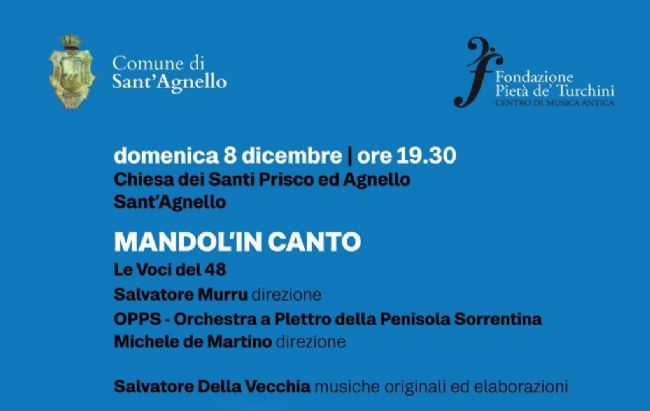Domenica 8 dicembre, nell’ambito del cartellone di eventi “ViviAmo il Natale” del Comune di Sant’Agnello, l’Orchestra a Plettro della Penisola Sorrentina e Le Voci del 48 si esibiranno alle 19:30 presso la Chiesa dei Ss. Prisco e Agnello nel concerto intitolato “Mandol’in Canto”, in collaborazione con la Fondazione Pietà de’ Turchini.