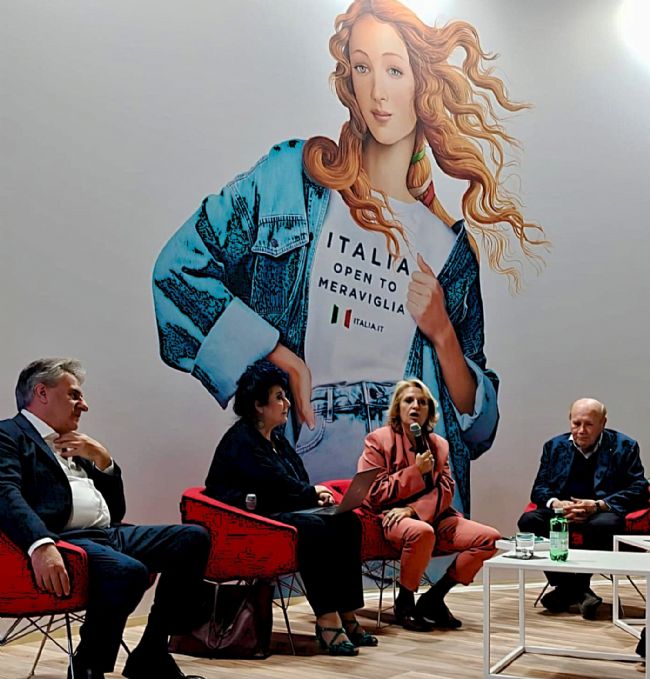 Durante la conferenza stampa di martedì mattina organizzata dalla regione Campania nello spazio Enit in cui sono state annunziate le principali mostre museali del 2026 e l'intera destinazione campana sono intervenuti Rosanna Romano, Direttore generale del Turismo e Cultura della Regione Campania, Gino Acampora, presidente degli Agenti di viaggio della Penisola Sorrentina, e Marisa Laurito, madrina dell’evento e il presidente Aanci Campania Francesco Morra.