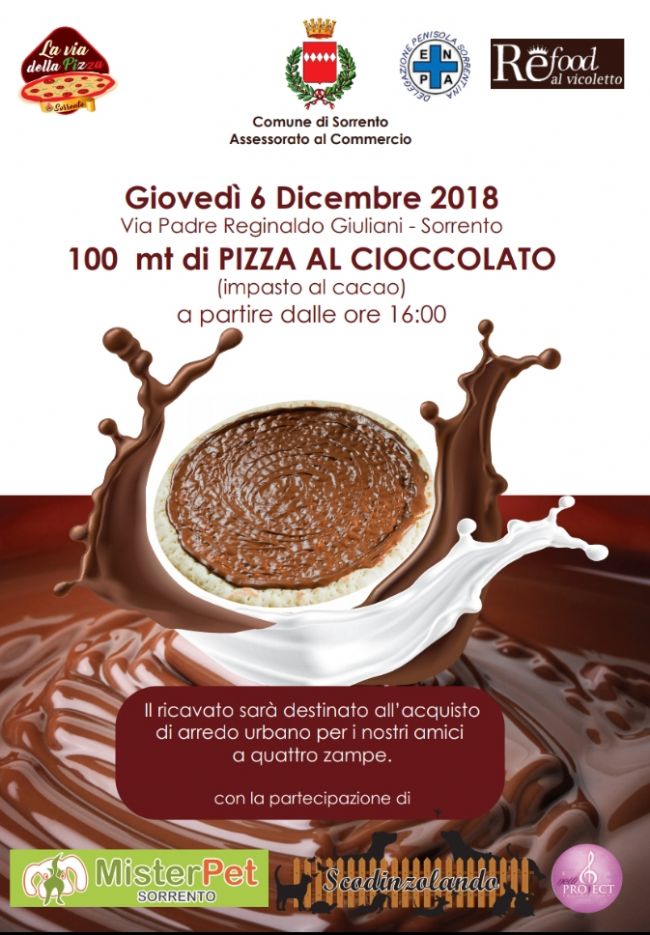 Cento metri di pizza, a base di un impasto al cacao ed interamente ricoperta di crema al cioccolato, invaderanno i vicoli della città. A realizzarla, un gruppo di pizzaioli, coordinati dallo staff del ristorante Re Food. Il ricavato del ticket, che prevede anche un assaggio di birra artigianale offerta dal Birrifico Sorrento, sarà destinato all'acquisto dell'arredo urbano come segnaletica, contenitori per le deiezioni e recinzioni, per le quattro aiuole di sgambamento per cani individuate dal Comune di Sorrento.