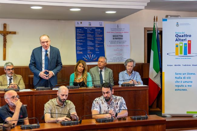 Tre palchi tra via Comizi, villa comunale Ciaravolo e palazzo Vallelonga. E ancora: circa duecento artisti, suddivisi in 19 diversi spettacoli; due convegni; due bande e sei formazioni musicali; tre compagnie di teatro amatoriale; tre attori professionisti; cinque formazioni musicali giovanili; quindici alunni dell'istituto Degni. Senza dimenticare gli otto artisti che stanno realizzando altari e tappeti. Sono alcuni dei numeri della festa dei quattro altari, pronta a tornare a Torre del Greco dopo sedici anni di assenza: il programma delle iniziative che si svolgeranno durante la tre giorni, da venerdì 19 a domenica 21 luglio, è stato presentato nel corso di una conferenza tenutasi in una gremita aula consiliare a palazzo Baronale. “Non nascondo che sono emozionato – ha detto il sindaco Luigi Mennella nel suo intervento, alla presenza tra gli altri del presidente del consiglio, Gaetano Frulio – Emozionato non tanto per avere dato seguito a ciò che è stato scritto nel programma elettorale, che è fatto per essere rispettato, ma per l'attenzione e la partecipazione che abbiamo riscontrato in questa occasione e nelle altre in cui abbiamo parlato del ritorno della festa. Assistere ad esempio al montaggio delle luminarie è bello e particolare. Sento in giro un'atmosfera diverse. La festa non deve essere letta come un momento fine a sé stesso: come amministrazione siamo convinti che questa ed altre manifestazioni siano un importante volano per lo sviluppo economico della città”.