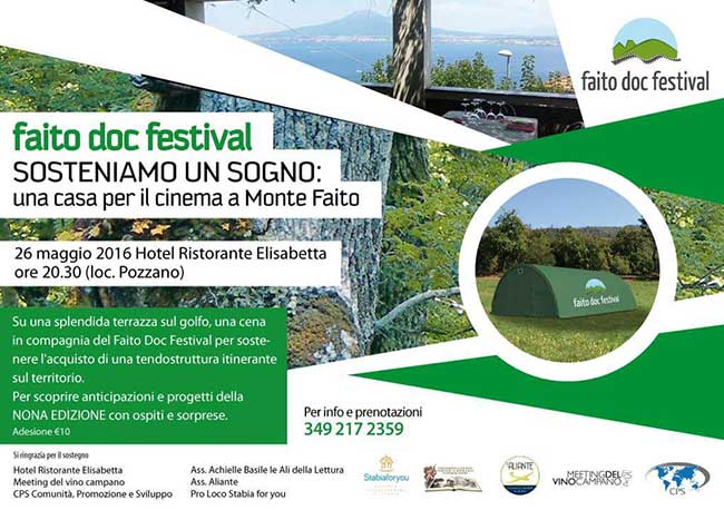 Si svolgerà giovedì 26 Maggio presso l'Hotel Elisabetta A POZZANO alle ore 20 e 30 la cena di sottoscrizione per raccogliere i fondi destinati all'acquisto di una Tendostruttura che diverrà anno dopo anno il «Cinema itinerante» del Faito Doc, ma anche « luogo » da condividere con altre associazioni per eventi sul Monte. Una serata da non perdere per i sostenitori e gli appassionati del cinema di alta quota. Nel corso della serata, infatti, sarà possibile ricevere anticipazioni sulla nona edizione del festiva, in compagnia di ospiti e sorprese.. Di pari passo gli organizzatori del Festival hanno lanciato una raccolta fondi anche su ulule.com "Il Faito DOC festival, Festival internazionale tematico del cinema documentario, per la sua nona edizione invita tutti gli amanti della montagna, tutti coloro che sognano, i fedeli del festival, gli altruisti, coloro che aspirano alla fratellanza e alla libertà, ad unirsi a noi per camminare decisi verso un mondo più empatico e gioioso. Passo dopo passo sempre costanti seppur con ritmo nuovo e diverso da «Fratellanza», «Rinascita», «Passione», «Identità», «Follia», «Movimento», «Empatia», «Ebbrezza» quest’anno il passo seguirà il ritmo del «RITORNO», tema dell’edizione 2016. Ritorno su ognuno di questi temi, anche grazie alla riapertura della FUNIVIA, museo a cielo Aperto…o ritorno al ricordo del «Cinema Ciclamino» che un giorno rinascerà sotto nuovi auspici''. Sostengono l'iniziativa l'hotel Elisabetta, il Meeting del Vino Campano, la C.p.s. Comunità. Promozione e Sviluppo, l'Associazione Achille Basile le Ali della Lettura, l'Associazione Aliante, l'associazione Pro Loco Stabia for you.