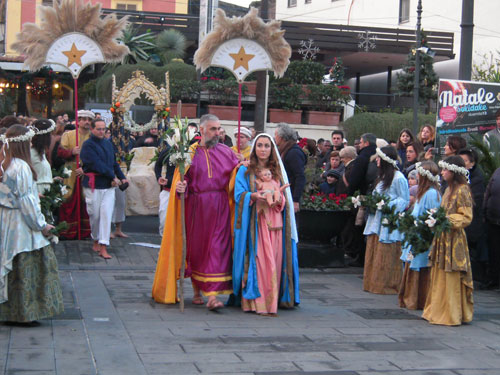 Questa prima parte del corteo raggiungerà il centro cittadino scendendo lungo via Raffaele Bosco, attraversando successivamente via Roma e piazza Umberto I. Qui ulteriore novità dell'edizione 2015: il gruppo della Natività si staccherà dalla sfilata per raggiungere piazza Kennedy in attesa del rito dell'Adorazione. Il resto del corteo proseguirà invece per via Filangieri e via San Ciro, dove incorporerà un secondo gruppo di figuranti, gli aristocratici. Questi nuovi personaggi saranno vestiti in abiti sontuosi di foggia settecentesca, provenienti dalla sartoria teatrale dell'associazione "Teatro Mio". Abiti di stile ovviamente contemporaneo alla tradizione presepiale del '700 napoletano, a cui l'intero corteo si richiama.