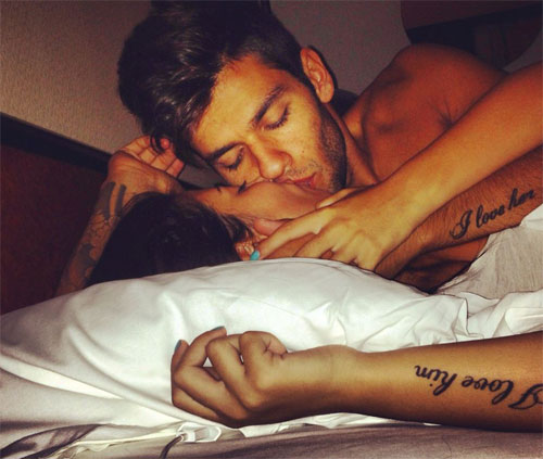 "Si ha quattro tatuaggi. Il primo che ha fatto è stato quello che ha sulle costole: dei fiori con le iniziali dei nomi dei componenti della sua famiglia. Poi ha due disegni sul braccio destro in stile giapponese, di cui uno simboleggia l'amicizia. Mentre in comune, abbiamo due tatuaggi: un'ancora e una scritta; "I love her" sul suo braccio sinistro e "I love him" sul mio braccio destro. Questi tatuaggi hanno per noi un valore molto importante: l'ancora sta ad indicare che il nostro amore è come un punto fermo della nostra vita, le scritte invece, indicano il grande amore che ci lega e che nessuno può cancellare".