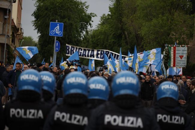 Momenti di tensione a Porta San Paolo a Roma, dove si stanno svolgendo le celebrazioni del 25 Aprile.