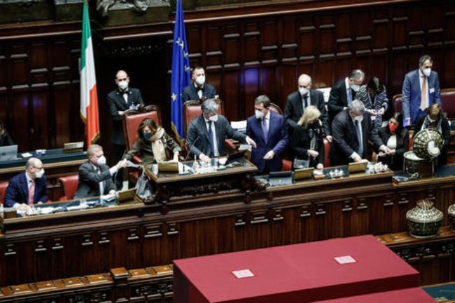 Nell'Aula di Montecitorio la prima votazione del Parlamento in seduta comune integrato dai delegati regionali per eleggere il presidente della Repubblica. Al banco della presidenza i presidenti di Camera e Senato Roberto Fico e Elisabetta Alberti Casellati. Prima dell'inizio della chiama Fico ha spiegato le modalità di voto. Il primo ad essere chiamato a votare è stato Umberto Bossi. Ogni grande elettore ha disinfettato le mani prima di ricevere la scheda, vota e quindi la depone nell'Insalatiera, l'urna in vimini e oro rivestita di raso verde che le contiene.