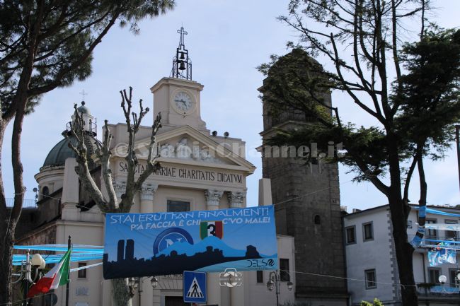 Ai piedi dei monti lattari , Santa Maria La Carità non si è fatta trovare impreparata e da qualche giorno le strade cittadine iniziano a fondersi con l’azzurro del cielo . “Da Lassù c’è mis na man pur tu!” affiancato dal Re di Napoli Maradona recita lo striscione affisso tra i palazzi di Via Petraro . Stai Eruttan finalmente p’à faccia è chi c’vo male! quello alle spalle della Chiesa .  Via Visitazione tutti gli artefici di questa cavalcata trionfale .  Cosa succederà al triplice fischio della gara che consegnerà la matematica al Napoli è difficile immaginarlo ma un antipasto è stato servito al ritorno da Torino .