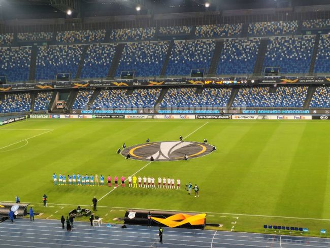 È una notte speciale. Non può essere altrimenti, visto che la quarta gara del girone F di Europa League si celebra il giorno dopo la notizia che nessuno sportivo avrebbe mai voluto dare. La morte di D10S, il più grande calciatore di tutti i tempi ha lasciato un vuoto incolmabile nel cuore dei napoletani, rimasti orfani del proprio idolo. L’uomo del popolo, che ha sempre messo in secondo piano il denaro, per combattere al fianco della sua gente per spezzare il dominio delle grandi potenze economiche italiane ed europee. Diego Armando Maradona si fonde con Partenope, che ne omaggia la memoria con manifestazioni di amore incondizionato in ogni angolo dalla città. Da Piazza Municipio, passando per Piazza del Plebiscito fino ad arrivare allo Stadio San Paolo dove la tifoseria organizzata realizza una fiaccolata che tinge di rosso il perimetro dell’inferno con la pista di atletica. Brividi.