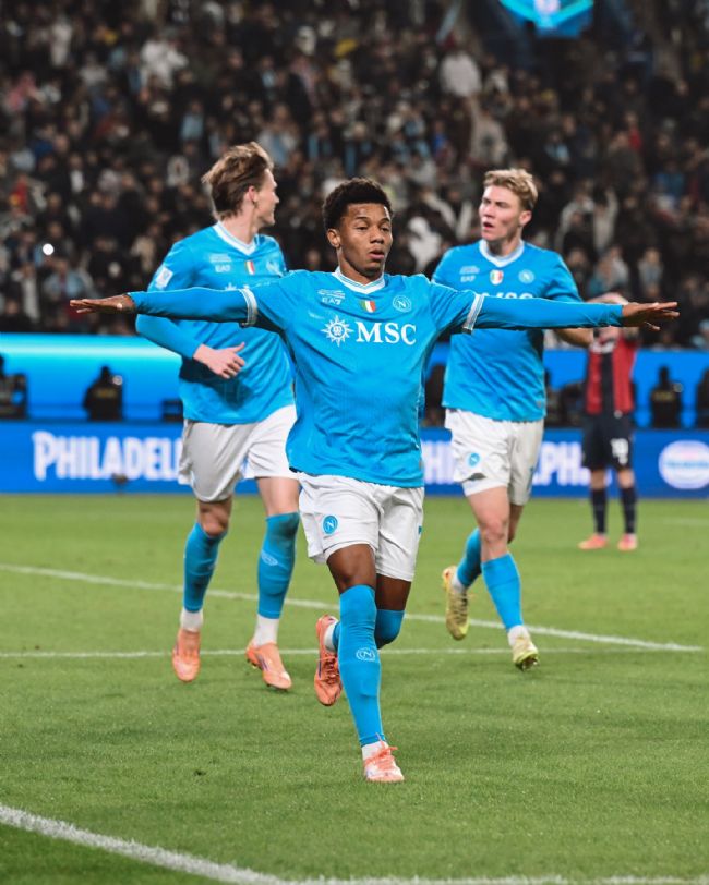 La seconda frazione di gioco si apre sulla falsariga della prima, con Ravaglia che si prende subito le copertine con un doppio intervento per negare la gioia del gol a Hojlund prima, e Rrahmani poi. Al 54’ Politano cerca e trova Hojlund, con il danese che aggira Heggem e calcia trovando solo i guantoni sicuri di Ravaglia. L’unico squillo del Bologna rischia di riaprire la contesa. Magia di Orsolini nei pressi della linea di fondo che lascia sul posto Juan Jesus: parabola arcuata sulla testa di Ferguson, ma l’incornata è troppo debole per impensierire Milinkovic-Savic. Passano soltanto 60 secondi, ed il Napoli mette l’ombrellino sul long drink. David Neres va di rabbia su un disimpegno lento e prevedibile di Ravaglia verso Lucumi, intercetta la sfera e poi trova la doppietta personale con un tocco sotto di pregevole fattura sull’uscita dell’estremo difensore emiliano. Al 65’ McTominay lancia Politano, palla in mezzo verso Hojlund, ma la retroguardia felsinea fa buona guardia ed evita il tris. Poco dopo Elmas trova l’imbucata per Hojlund, che carica il sinistro ma calcia alle stelle sprecando un’ottima chance di mettere anche la propria firma su una vittoria storica. Doppio cambio per Antonio Conte: dentro Lang e Gutierrez per Elmas e Spinazzola. Una nuova disattenzione della retroguardia di Italiano rischia di essere pagata a caro prezzo: Miranda svirgola, ma nè Hojlund nè Lang sono sufficientemente cinici per chiudere i giochi. Politano prova a sorprendere Ravaglia con una sassata mancina sul primo palo, ma senza esito. Spazio anche per Mazzocchi e Buongiorno. Il Napoli sfiora il tris dei minuti finali: Gutierrez si invola sulla corsia mancina, e fa partire un cross calibrato sul palo lungo che Politano, da zero metri, non riesce a depositare nella porta ormai totalmente sguarnita. In pieno recupero Politano prova a inventarsi assistman imbeccando Lang, ma l’attaccante olandese non va oltre l’esterno della rete. Dopo 4 minuti di recupero arriva il triplice fischio finale, con il Napoli che può festeggiare con pieno merito la terza Supercoppa della propria storia.