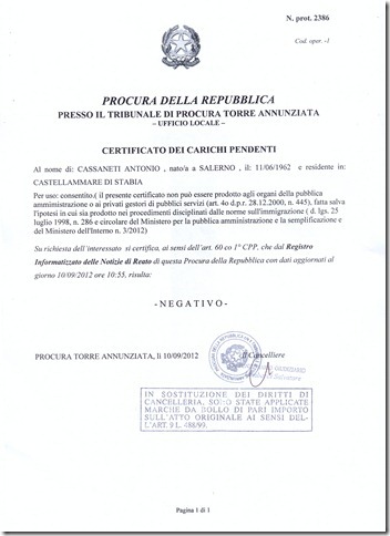 Cassaneti, da parte sua, questa mattina si è recato presso il tribunale di Torre Annunziata per richiedere i certificati del casellario giudiziale e dei carichi pendenti che lo riguardano. Dagli stessi, come si evince dalle immagini sotto riportate, inviateci dallo stesso Cassaneti, non è riportata alcuna annotazione a suo carico.