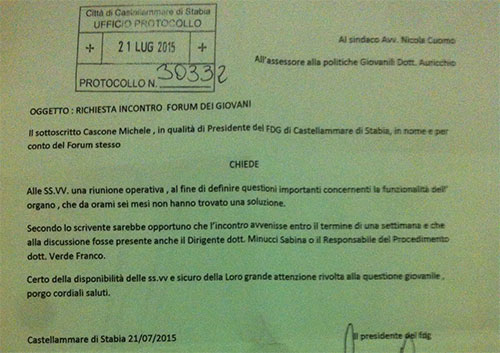 Lo scorso 21 Luglio è stata inoltrata all' Ufficio Protocollo una richiesta di incontro all' Assessore alle Politiche Giovanili, Dott.ssa Auricchio per "definire questioni importanti concernenti la funzionalità dell' organo" si legge nella lettera. Un incontro in tempi celeri per ridefinire questi problemi e cercare di risolverli quanto prima. È passato più di un mese e non è pervenuta nemmeno una risposta scritta al Forum dei Giovani.