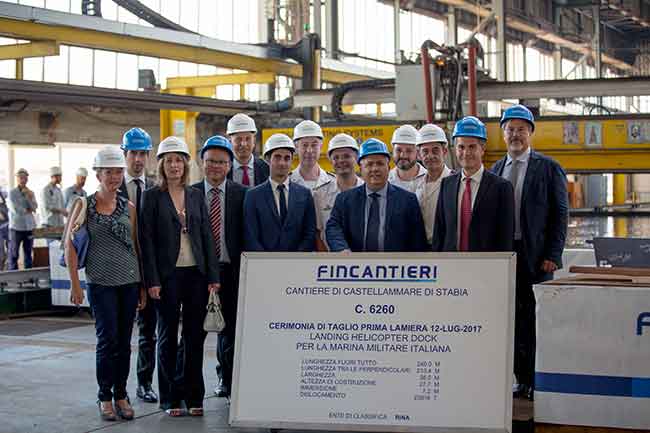 Si è svolta oggi presso lo stabilimento stabiese di Fincantieri la cerimonia per il taglio della prima lamiera, che dà il via ai lavori dell’unità anfibia multiruolo (LHD ovvero Landing Helicopter Dock)..