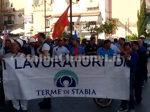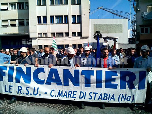 Nel corteo di protesta, tra i lavoratori Fincantieri è apparso anche uno striscione delle Terme di Stabia, realtà industriale locale ormai fallita e con i suoi ormai ex 200 lavoratori senza un lavoro.
