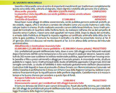 L'housing sociale del rione Savorito rischia di trasformarsi in un caso politico. L'imponente piano di riqualificazione del quartiere attraverso una gara d'appalto per complessivi 63 milioni di euro è stato accolto con stupore e svariati encomi da parte dell'intera città. Il progetto prevede la costruzione di 62 alloggi a libero mercato convenzionato, 105 alloggi di edilizia residenziale con affitto a prezzi calmierati e 31 alloggi da cedere al Comune e prenderà il via in seguito alla demolizione dei 189 prefabbricati esistenti. A ciò si aggiungerà la realizzazione di un centro commerciale, di un polo per l'infanzia, di un impianto per la raccolta dei rifiuti e di un parcheggio interrato, il tutto con l'intento dichiarato di valorizzare le periferie e di contrastare la segregazione urbana e abitativa delle fasce meno agiate. L'ex assessore all'Urbanistica, Alessio D'Auria, ha colto così l'occasione per elogiare l'operato dell'amministrazione Cuomo, adducendo ad una presunta continuità operativa messa in atto tra la precedente gestione e quella transitoria attuale, con a capo il commissario prefettizio Vaccaro. D'Auria ha sottolineato, in particolare, la fiducia di cui ha goduto il Comune di Castellammare per ricavare i fondi destinati al restyling del Savorito, dato che 13 milioni provengono dalla Regione e 42 milioni derivano dal consorzio di imprese che si occuperà della realizzazione dell'opera, attribuendo quindi alla gestione Cuomo i meriti del progetto. Attraverso i social, tuttavia, immediata è sopraggiunta la reazione dell'ex sindaco Luigi Bobbio, che rivendica con decisione i “diritti d'autore” sul piano di riqualificazione del rione Savorito: «Campate ancora sul lavoro mio e della mia amministrazione - scrive Bobbio -. Inutile dire che se fossi rimasto sindaco i lavori sarebbero già partiti da un bel pezzo». La faida tra Bobbio e i dirigenti comunali scelti da Cuomo, però, crolla dinanzi ad una relazione presentata da Salvatore Vozza al termine della sua esperienza a Palazzo Farnese, all'interno della quale l'ex primo cittadino stabiese si sofferma sull'avvenuta approvazione del progetto di abbattimento e ricostruzione dell'Aranciata Faito per una cifra che si aggira proprio sui 63 milioni di euro (21 pubblici e 42 privati), curiosamente lo stesso budget destinato ai lavori che presto prenderanno il via nel suddetto quartiere. «Giù i prefabbricati pesanti dell'Aranciata Faito - si legge nell'opuscolo riassuntivo di Vozza -, dove ci sono 189 alloggi ormai fatiscenti realizzati dopo il terremoto dell' '80 come temporanei e che sono rimasti in piedi per decenni. Saranno sostituiti da 282 nuove case suddivise tra edilizia residenziale pubblica, appartamenti per housing sociale (vendita o fitto a prezzi calmierati) e alloggi per il mercato privato. A circondarle verde, strutture pubbliche e negozi. Sono i tratti principali dello studio di fattibilità approvato il 26 gennaio 2010 dal consiglio comunale. Lo studio di fattibilità è stato realizzato gratuitamente dall'ACEN (Associazione Costruttori Edili Napoli) in base al protocollo d'intesa firmato con l'amministrazione comunale nel 2008. L'iniziativa è perfettamente in linea con il Piano Casa della Regione Campania, laddove si prevedono finanziamenti per la riqualificazione delle periferie degradate. Castellammare si è mossa in tempo e ha buone chances per accedere a questo tipo di fondi». Vozza, in effetti, ci aveva visto lungo e i suoi successori hanno portato avanti un'iniziativa promossa anni addietro dalla sua amministrazione, che già nel 2010 aveva fornito le linee guida su cui si fonda il progetto attuale.