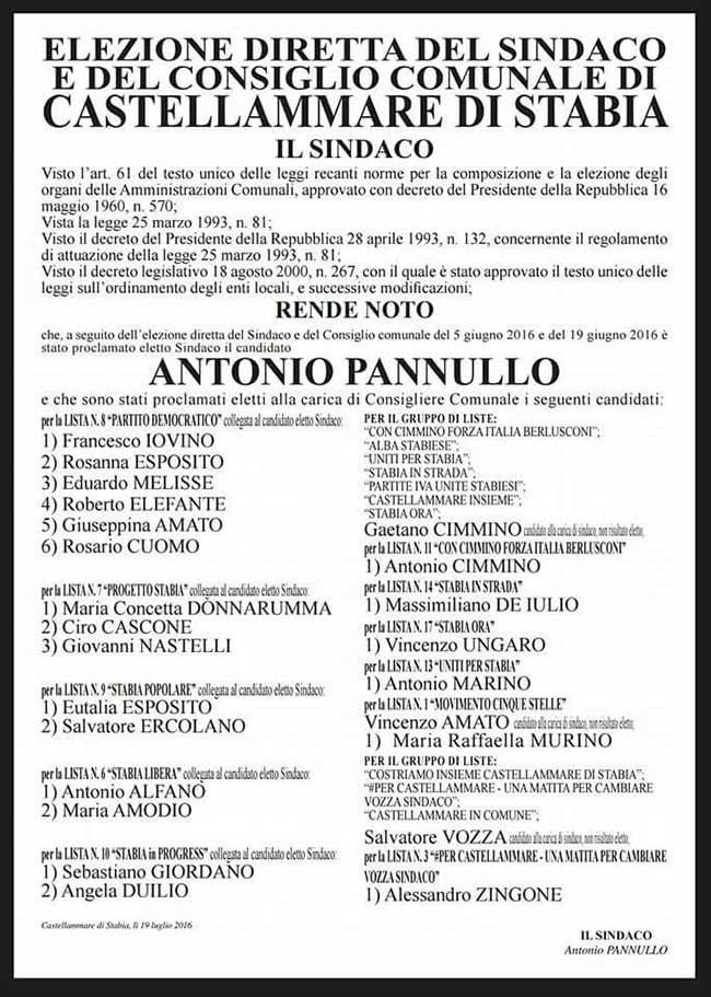 Si compone ufficialmente per intero la squadra di governo cittadino a cui farà capo il sindaco Antonio Pannullo. Dopo la nomina degli assessori, avvenuta due settimana fa, nella giornata odierna il primo cittadino ha reso nota la proclamazione del nuovo consiglio comunale. La commissione, nei giorni scorsi, dopo aver analizzato il riconteggio dei voti, aveva sciolto l'unico dubbio legato all'assegnazione dell'unico seggio ancora in dubbio tra i banchi dell'opposizione. L'assoluta parità nei consensi per le due liste Castellammare Insieme e Uniti per Stabia aveva indotto la commissione a provvedere all'assegnazione del seggio tramite sorteggio e la buona sorte ha premiato Antonio Marino a scapito di Emanuele D'Apice, il quale ha già annunciato il ricorso al Tar. Anche la nota presentata da Castellammare in Comune è stata stralciata dalla commissione, che ha lasciato inalterata la distribuzione dei consiglieri fra i due schieramenti. Ecco, dunque, l'attuale consiglio comunale.
