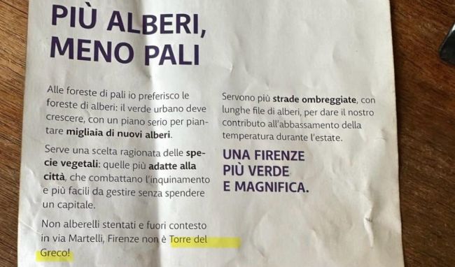 A parlare è il sindaco di Torre del Greco, Luigi Mennella. Il primo cittadino stringe tra le mani un volantino elettorale che sta circolando in queste ore a Firenze per promuovere la campagna elettorale del candidato a sindaco del centrodestra Eike Schmidt e della lista civica che porta il suo nome. Nel volantino, dal titolo “Più alberi, meno pali”, si legge “Firenze non è Torre del Greco”: “Sorprende ancora di più – prosegue Mennella – che questa squallida propaganda venga da chi, come Schmidt, dovrebbe conoscere bene le nostre zone, ricoprendo da inizio anno il ruolo di direttore del Museo e del Real Bosco di Capodimonte di Napoli. Lui, che pure è nato in Germania, all’atto del suo insediamento a Capodimonte ha dichiarato: “Arrivando, mi sono girato ad ammirare il golfo di Napoli e mi si è allargato il cuore come sempre quando vengo in questa meravigliosa città (https://capodimonte.cultura.gov.it/staff-member/eike-schmidt-direttore/)”.