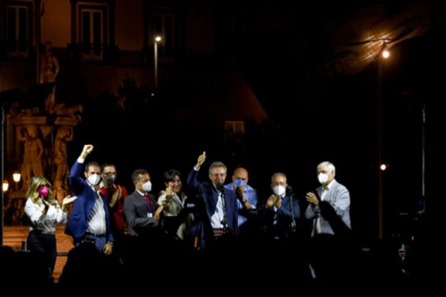 Poi è salito sul palco, insieme con alcuni esponenti della coalizione di centrosinistra ed M5S, per un brevissimo intervento.