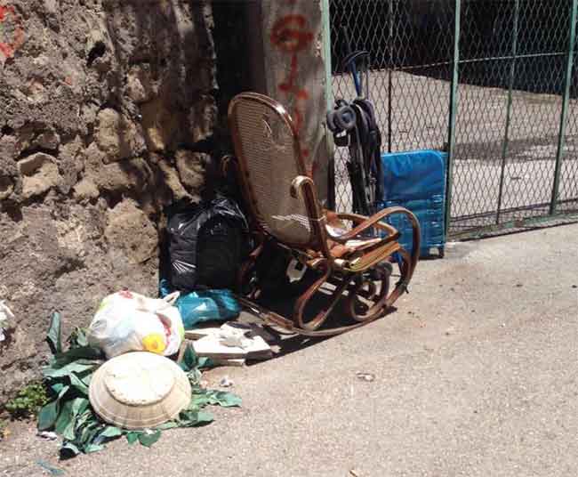 Emergenza rifiuti: dal centro alle periferie della città sono sempre più numerosi i pompeiani che puntano il dito contro lo stato d’abbandono delle strade, trasformate in molti casi in ‘discariche’ a cielo aperto. Dopo i casi emblematici di via Civita Giuliana, via Grotta, via Molinelle e via Ripuaria (solo per citare alcuni esempi), è la volta di via Duca d’Aosta, nel cuore del centro cittadino, a pochi passi dal municipio e dalla basilica pontificia. Davanti al cancello di uno stabile si notano rifiuti di varia natura, tra i quali una sedia a dondolo in legno (in foto), evidentemente depositati lì nella speranza di un ritiro a stretto giro da parte della ditta incaricata dal Comune, la New Ecology, oppure abbandonati illegalmente da qualcuno. L’episodio, risalente a qualche giorno fa, accende ancora una volta i riflettori sul servizio di raccolta rifiuti porta a porta. Dalla foto è assolutamente palese che, in pieno giorno, i rifiuti sono ancora accantonati in attesa di essere rimossi. Il tutto avviene nel cuore del centro cittadino, che non è nuovo a scene simili. Situazioni analoghe si verificano spesso anche in via Lepanto, via Parroco Federico, via Anastasio Rossi e non solo. Il disagio patito dai residenti potrebbe divenire ancor più insopportabile con l’inizio della stagione estiva, quando le temperature roventi potrebbero contribuire all’insorgere dei cattivi odori e al proliferare di insetti e ratti.