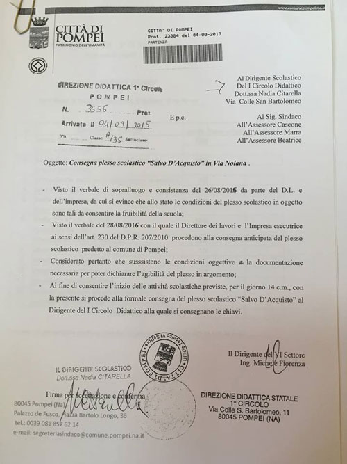 Il plesso scolastico "Salvo D'Acquisto" di via Nolana è stato formalmente consegnato alla direzione didattica del I Circolo di Pompei, con a capo la dirigente scolastica Nadia Citarella. La notizia è stata comunicata con una lettera indirizzata, oltre che alla stessa direttrice, anche al sindaco di Pompei Ferdinando Uliano e agli assessori Santa Cascone, Raffaele Marra e Margherita Beatrice. Nell'oggetto del documento, consegnato il 4 settembre 2015 (prot. n°3556), si legge: "consegna plesso scolastico "Salvo D'Acquisto" in via Nolana. In calce al documento, si specifica testualmente: "Al fine di consentire l'inizio delle attività scolastiche previste per il giorno 14 c.m. con la presente si procede alla formale consegna del plesso scolastico "Salvo D'Acquisto" al Dirigente del I Circolo Didattico alla quale si consegnano le chiavi".