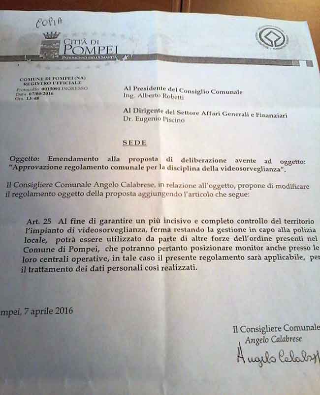 «Si è pensato di aggiungere un altro articolo per migliorare ancora di più il regolamento così da favorire una maggiore sinergia tra le forze dell’ordine». Queste le parole del consigliere comunale di maggioranza Angelo Calabrese (a microfono in foto) per introdurre, nel corso della pubblica assise dello scorso 8 aprile, il suo emendamento in riferimento al regolamento che disciplina il sistema di videosorveglianza comunale. Il nuovo articolo aggiunto è il n.25 per l’esattezza. Di seguito, il suo contenuto integrale. «Al fine di garantire un più incisivo e completo controllo del territorio l’impianto di videosorveglianza, ferma restando la gestione in capo alla polizia locale, potrà essere utilizzato da parte di altre forze dell’ordine presenti nel Comune di Pompei, che potranno pertanto posizionare monitor anche presso le loro centrali operative, in tale caso il regolamento sarà applicabile, per il trattamento dei dati personali così realizzati».